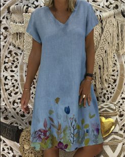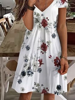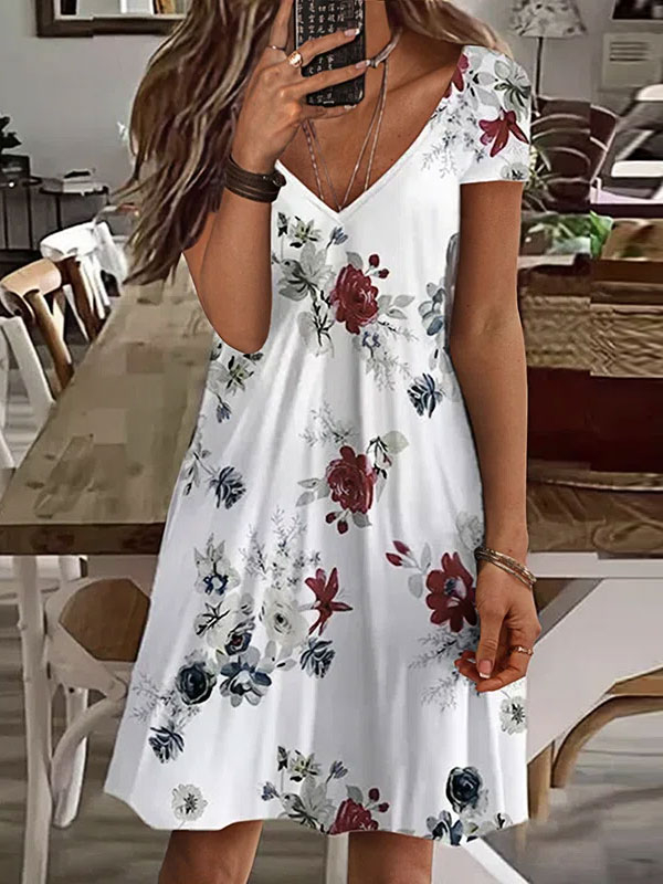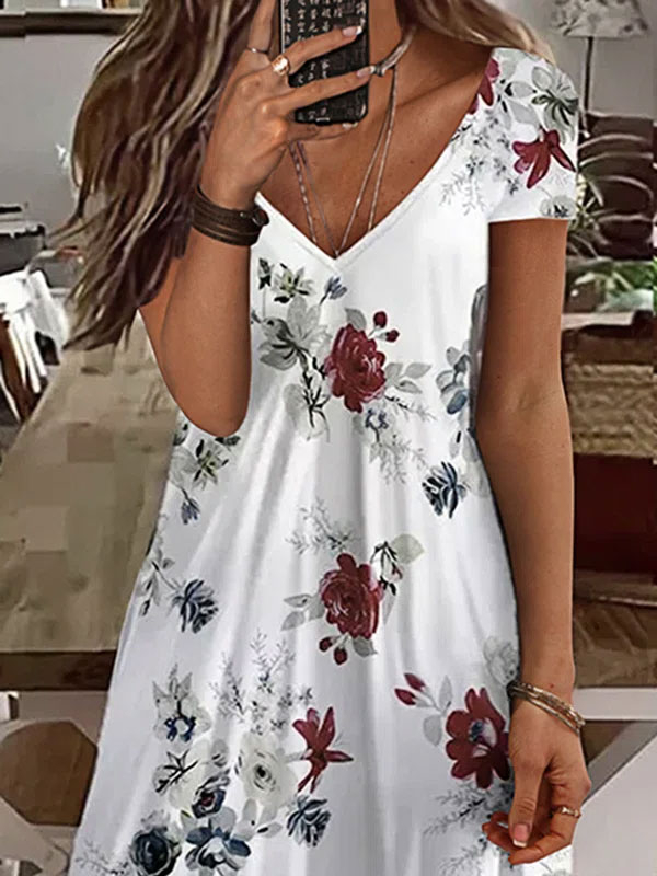 Boho Floral V neck Short Sleeve Knit Dress