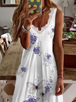 Casual Butterfly Sleeveless V Neck Plus Size Printed Dress