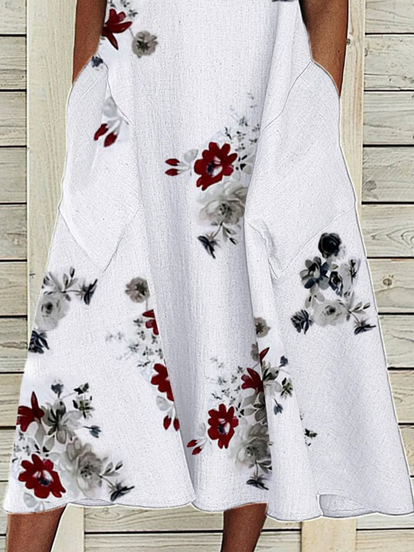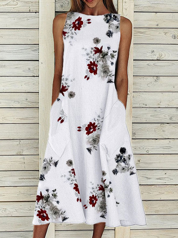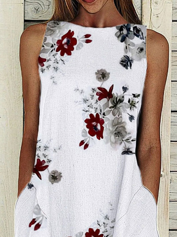 Floral Printed Sleeveless Cotton Blend Shift White Casual Dress