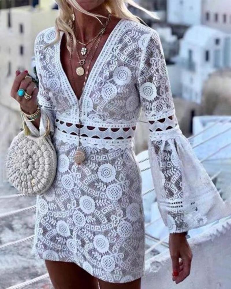 Lace Cut Out V-neck Long Sleeve Elegant Mini Dress