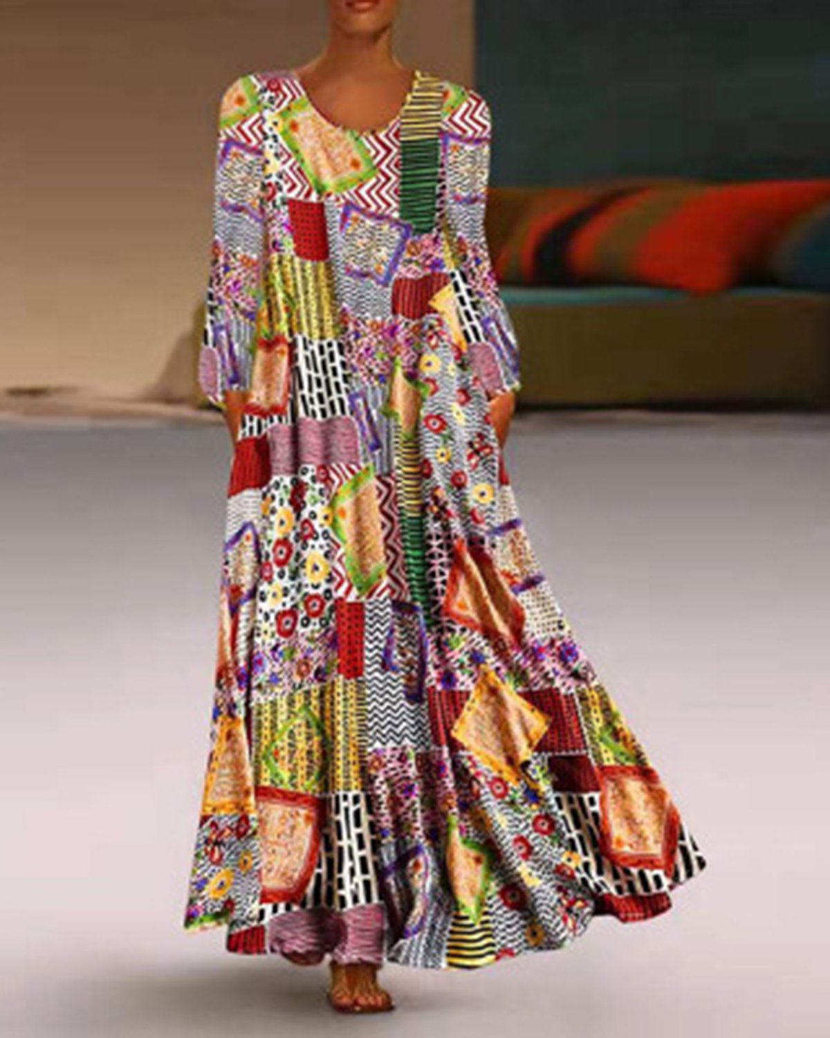 Long Sleeve Floral Printed Color Block Maxi Dresses