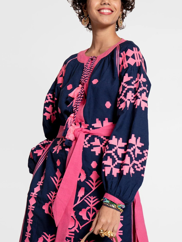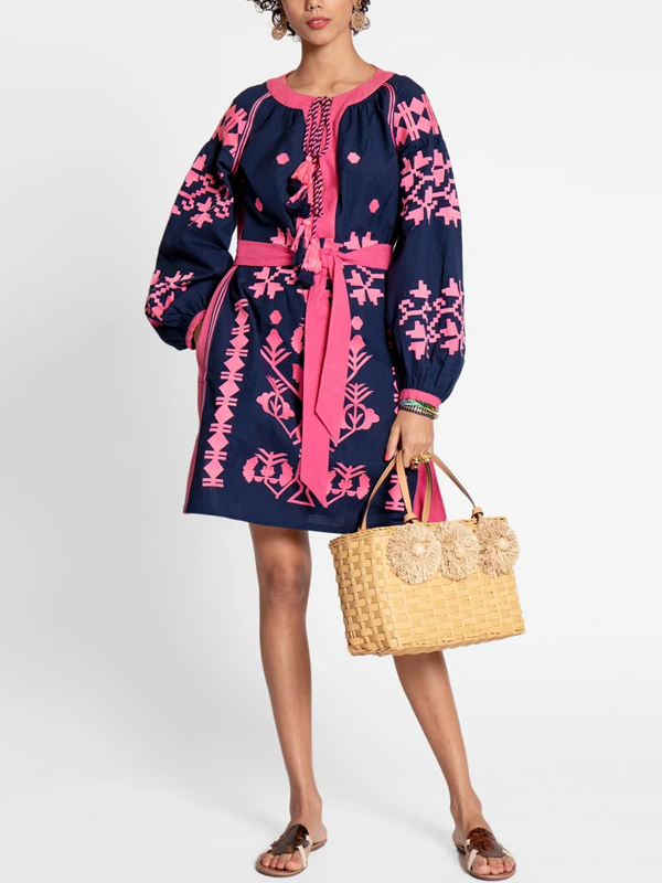 Printed Crew Neck Long Sleeve Dress