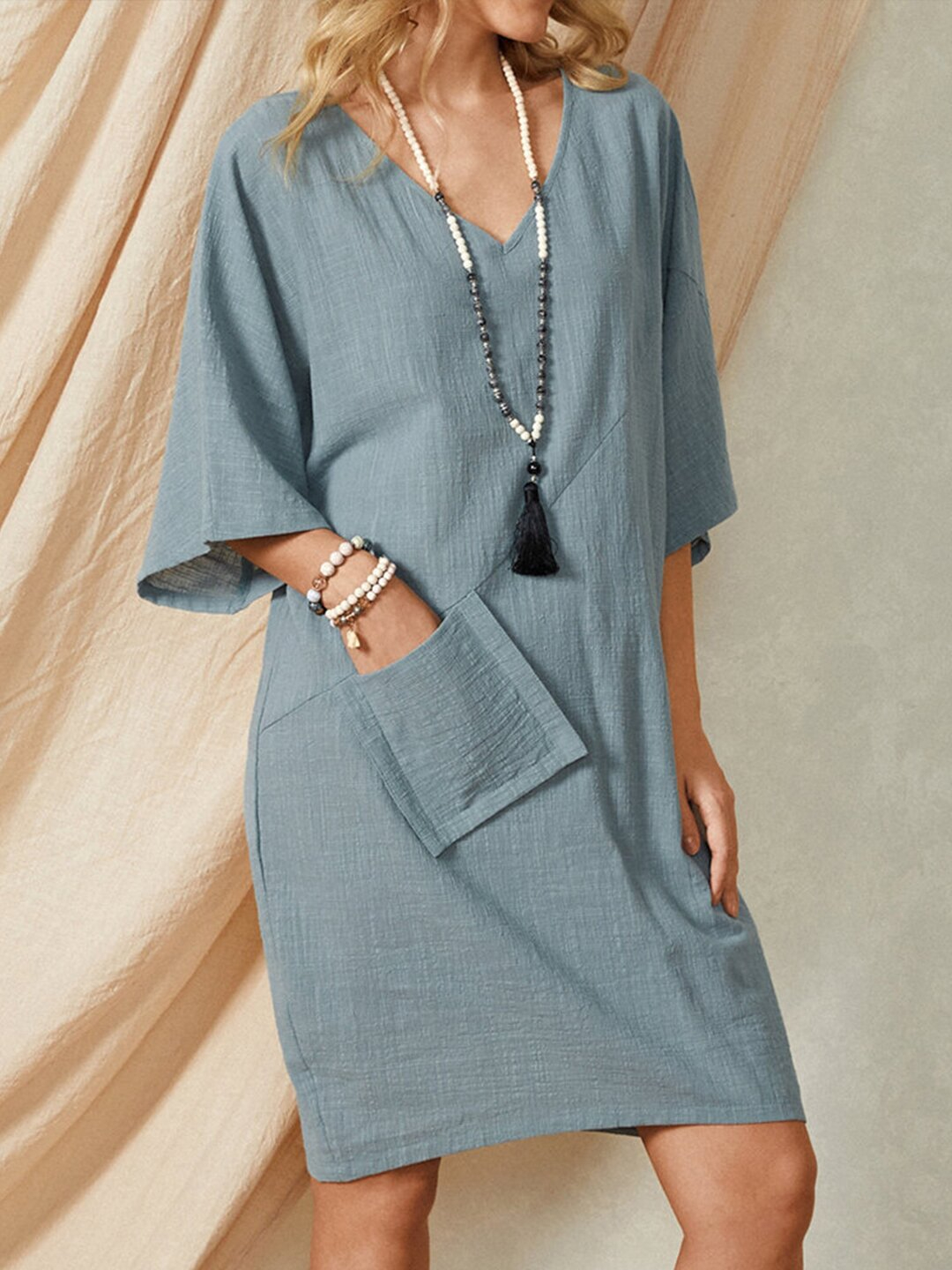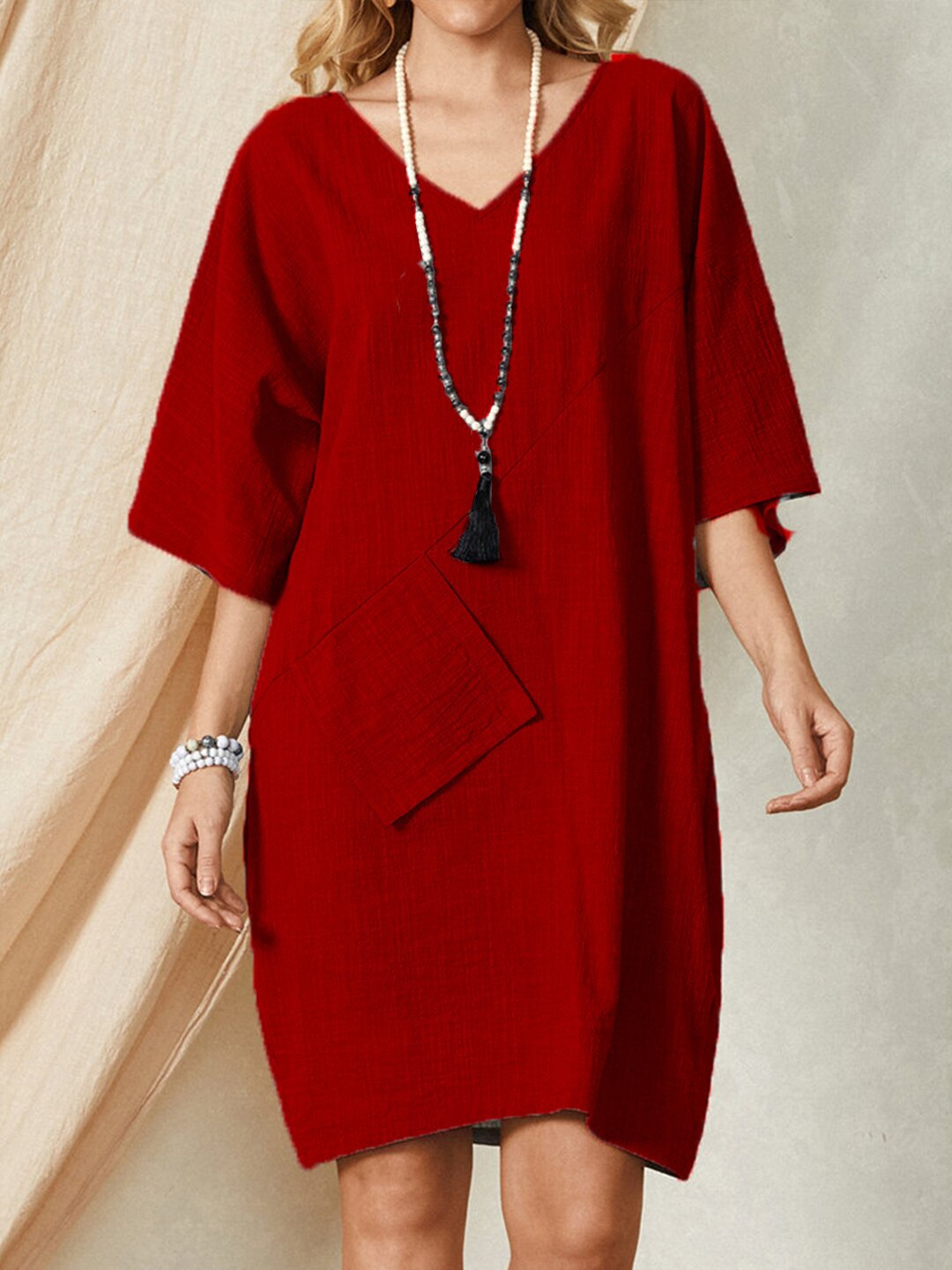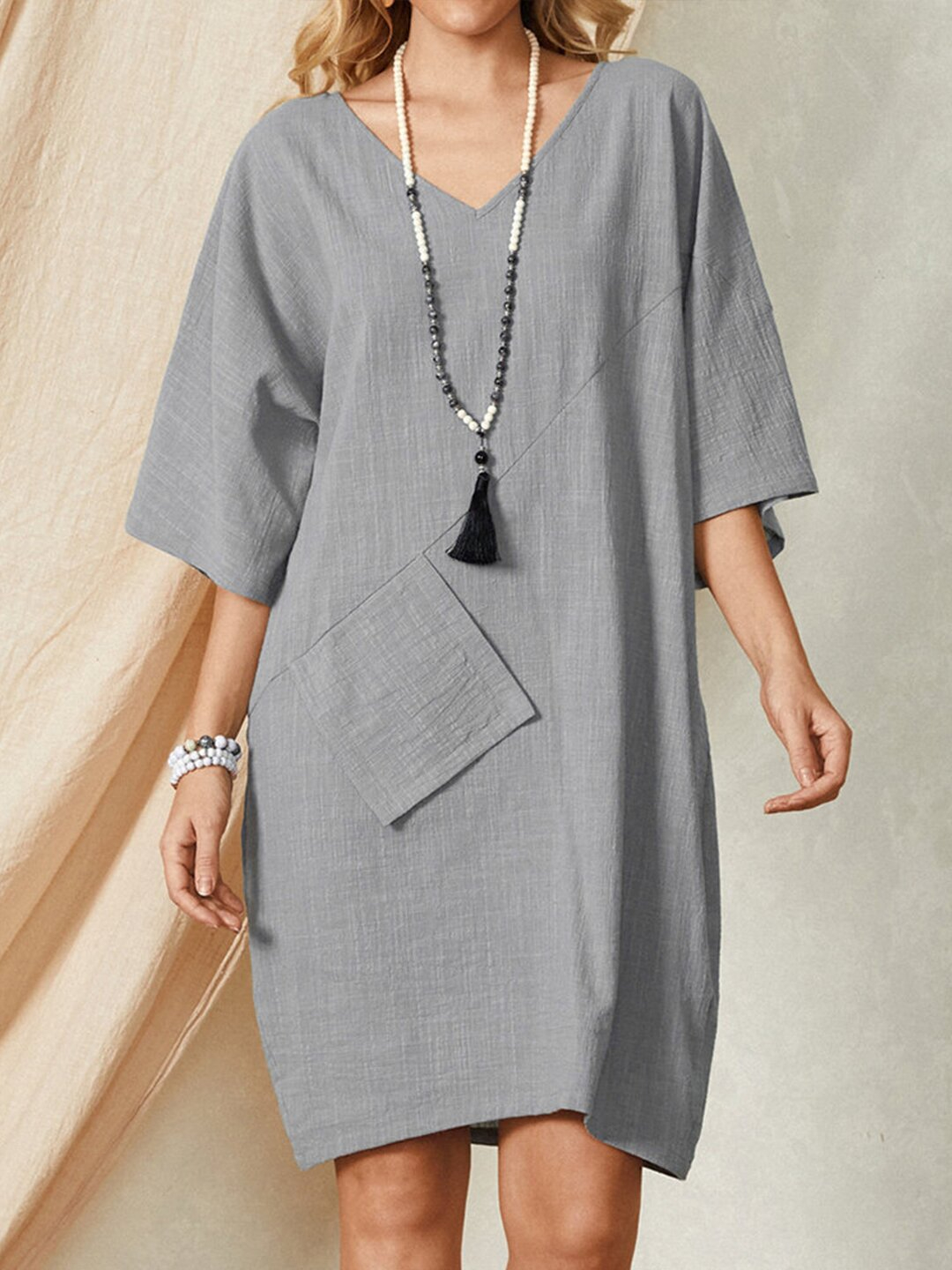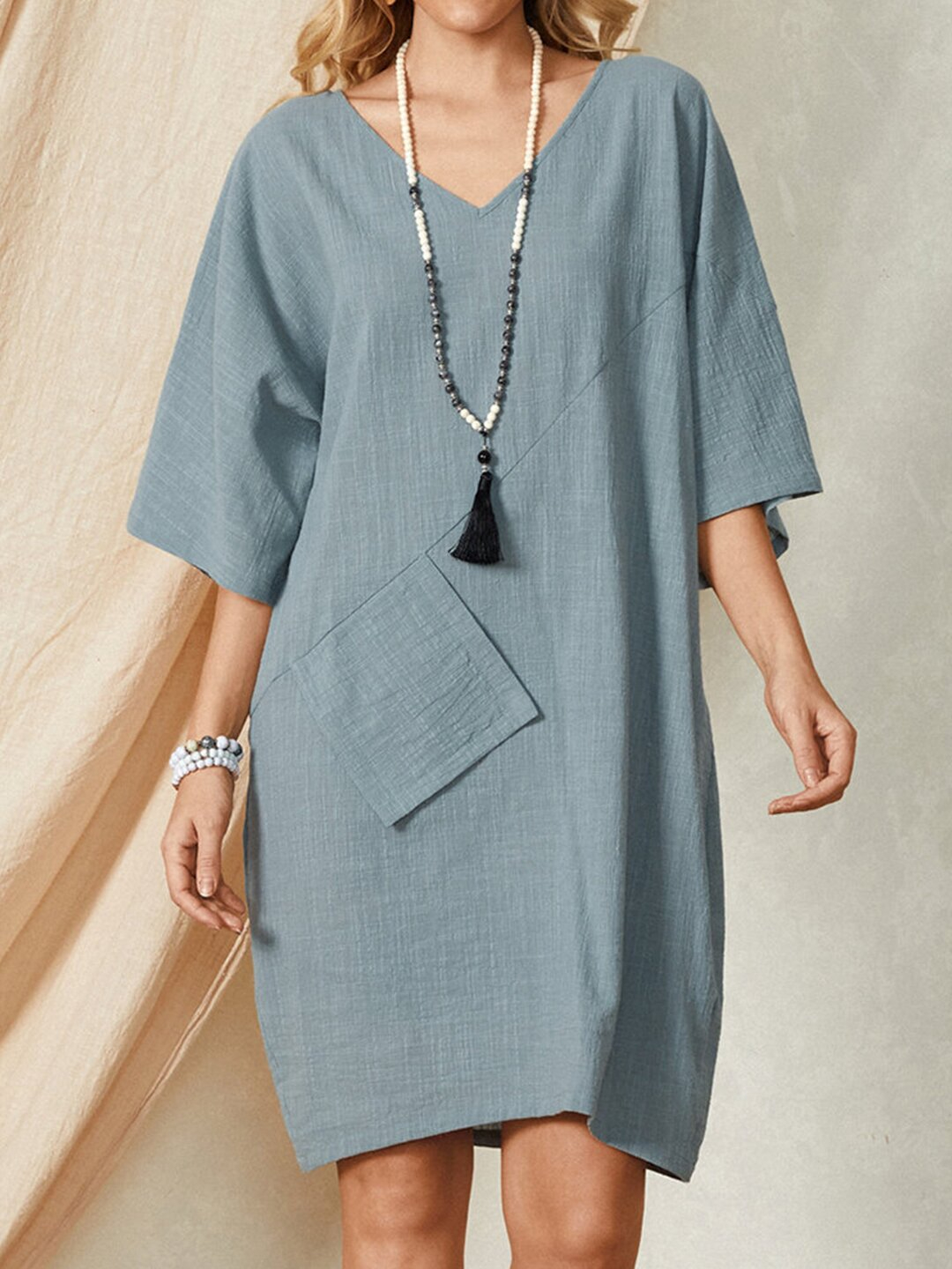 Pure Color Design Sense Bag Casual V-Neck Cotton And Linen Dress