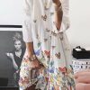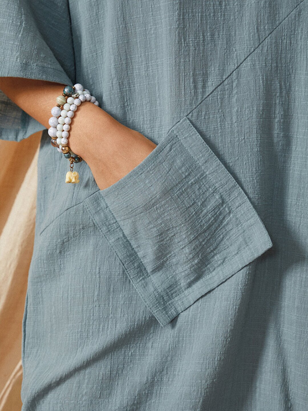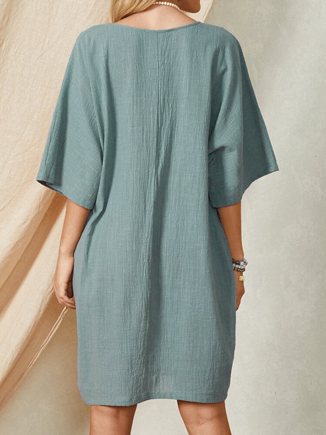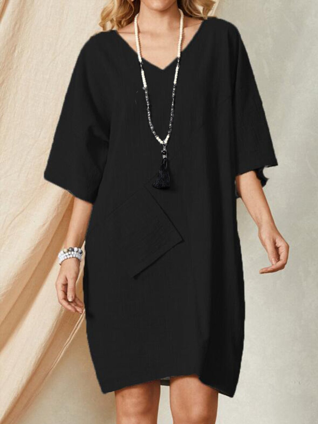 Pure Color Design Sense Bag Casual V-Neck Cotton And Linen Dress