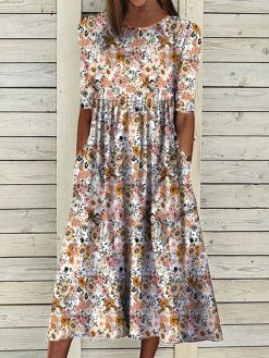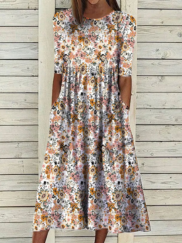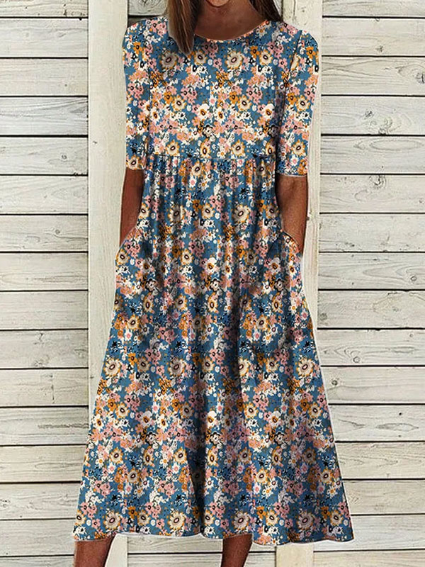 Round Neck Floral Casual Midi Dresses