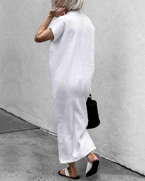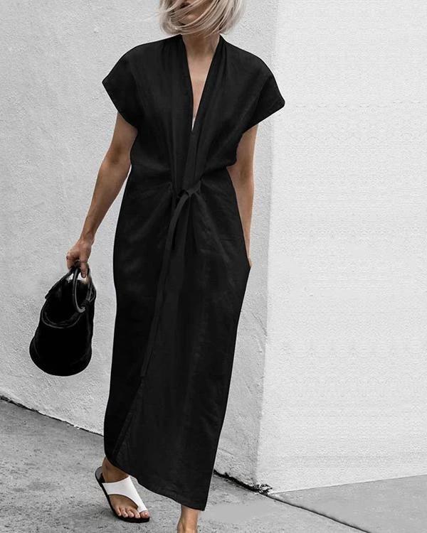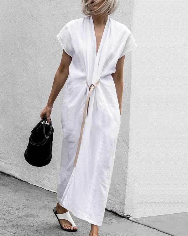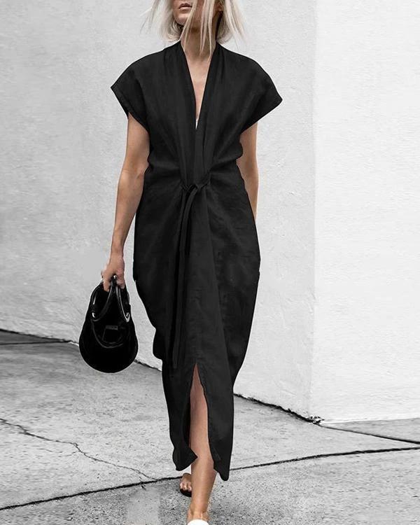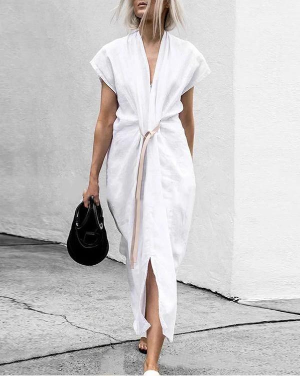 Summer Solid V-Neck Split With Belt Plus Size Dress