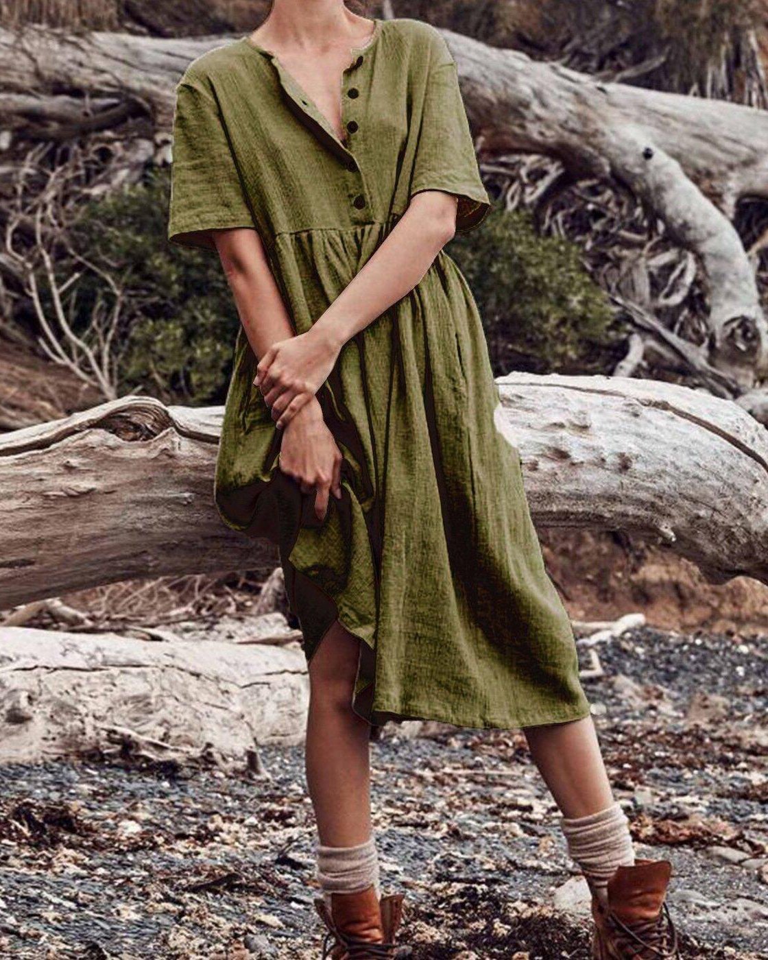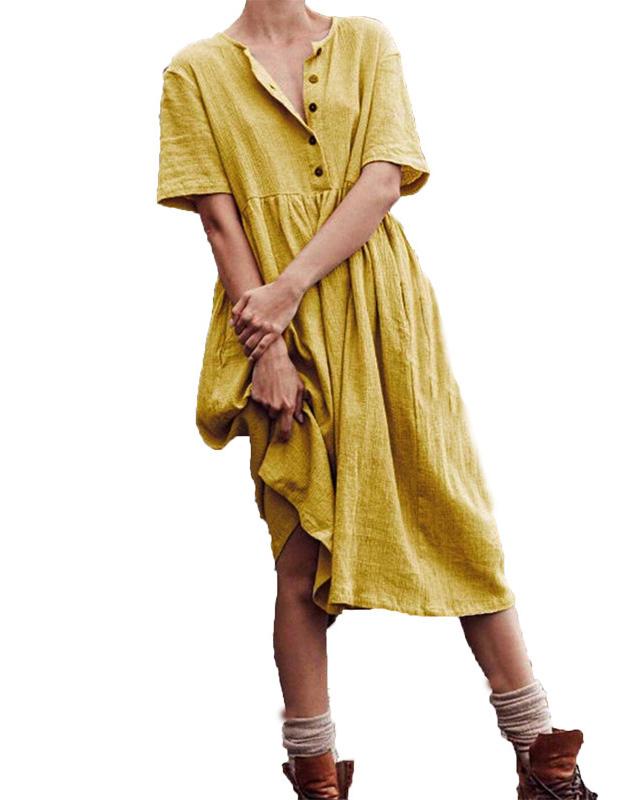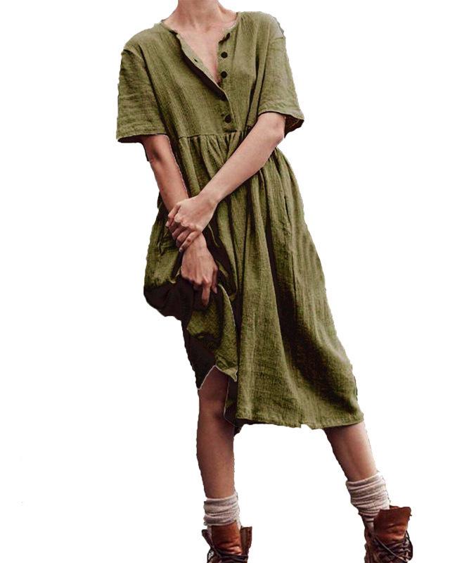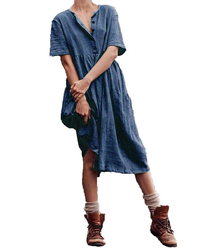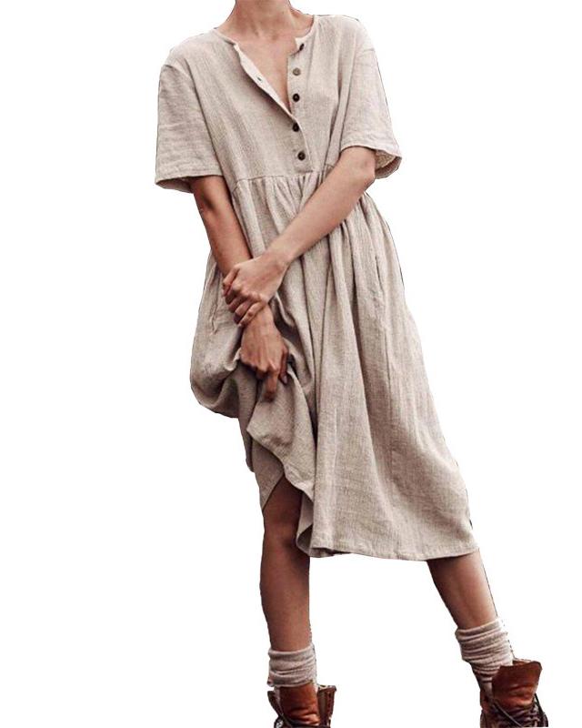 V-neck button cotton and linen straight dress