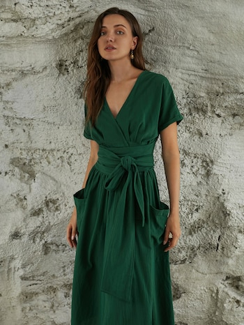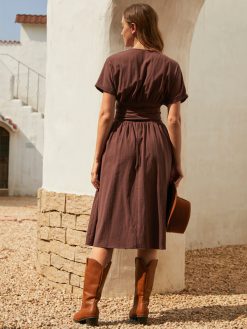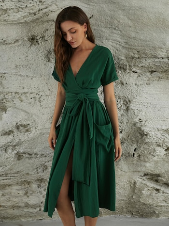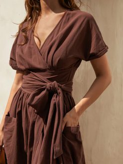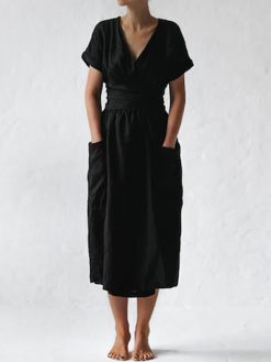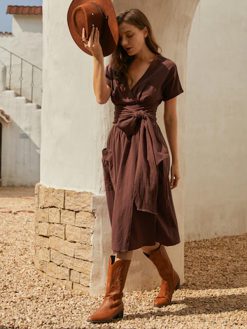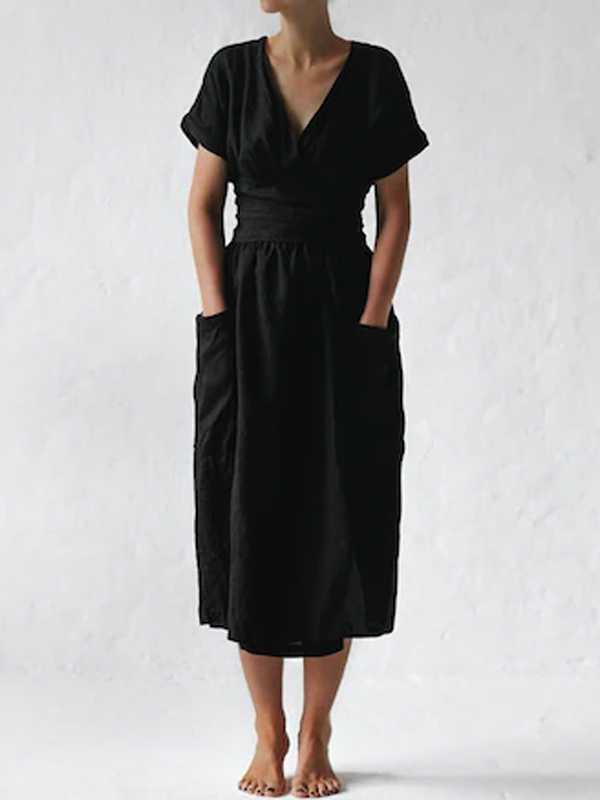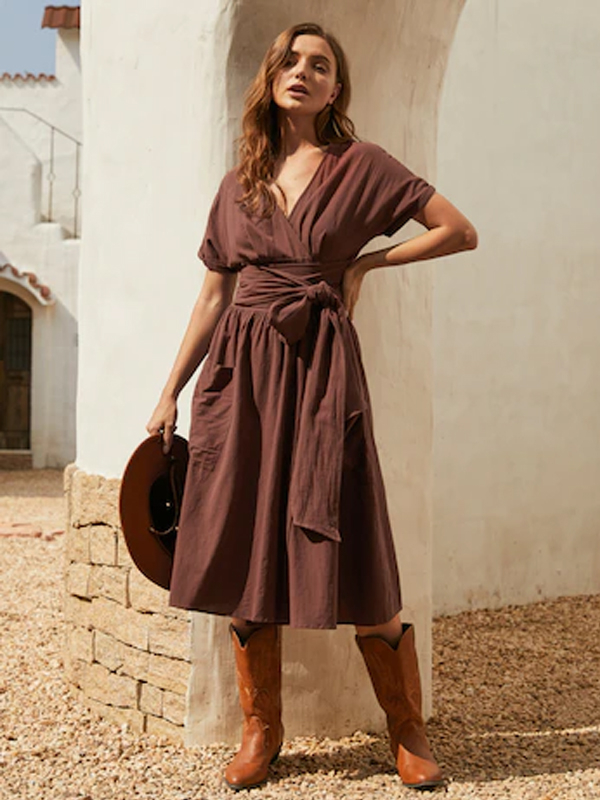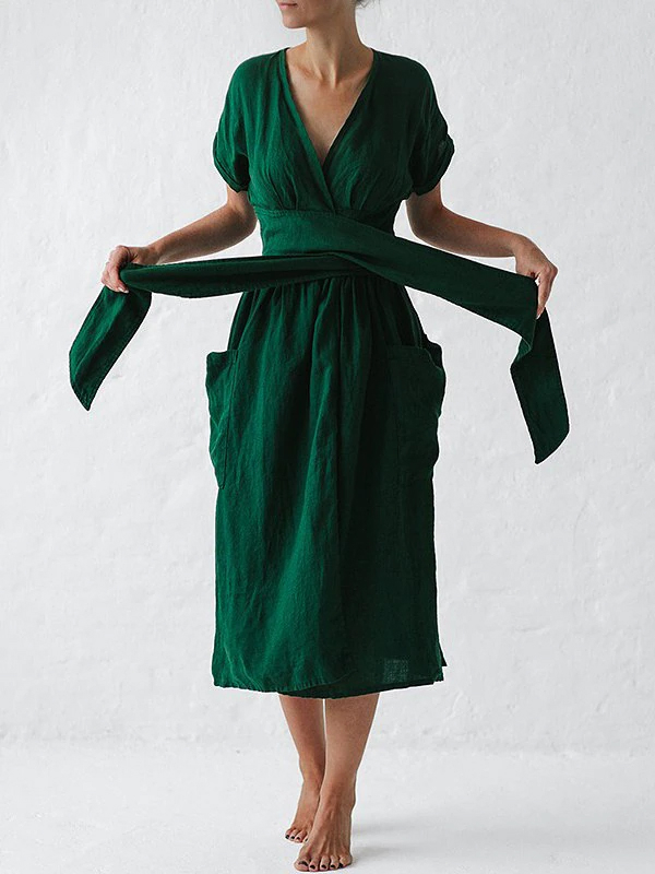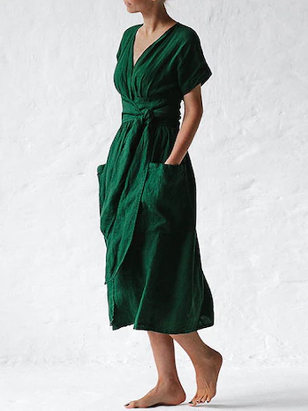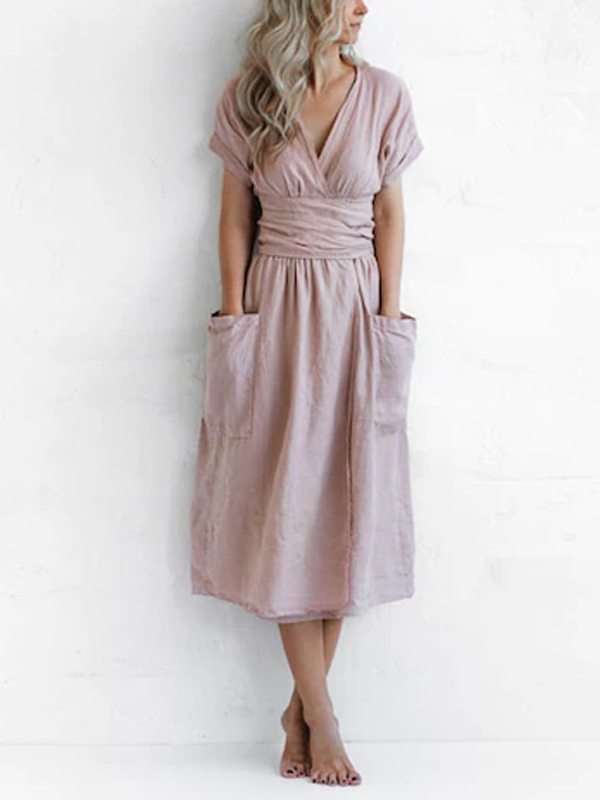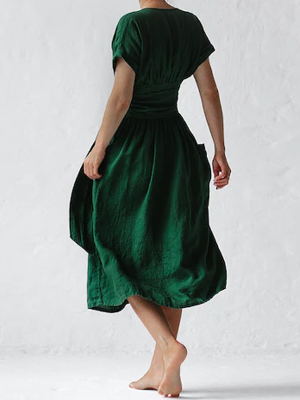 V-Neck Cottagecore Belt High Waist Comfy Casual Short Sleeve Maxi A Line Dress