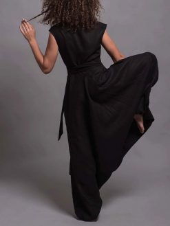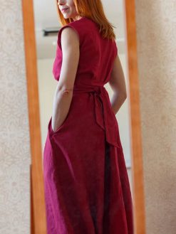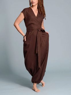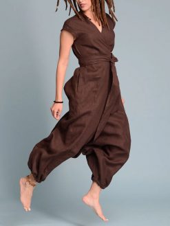 V-neck cotton linen casual simple temperament ladies jumpsuit