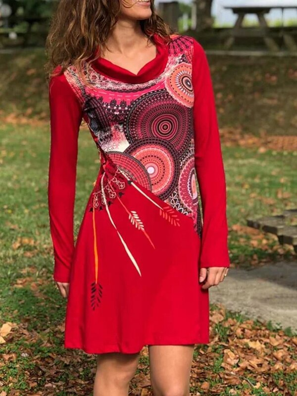 Women’s Pile collar Long Sleeve Printed Splicing Dress