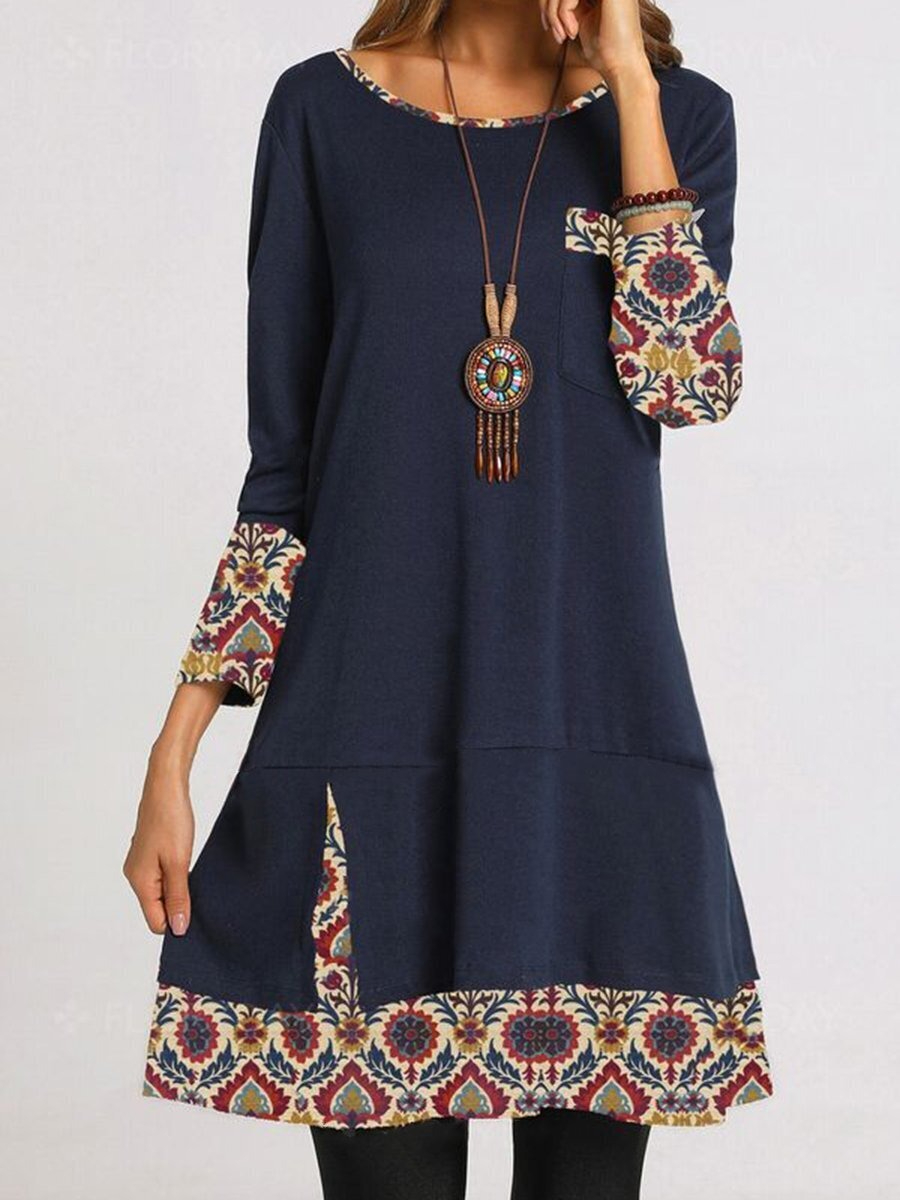 Women’s Round neck Long Sleeve flowers Printed Dress