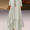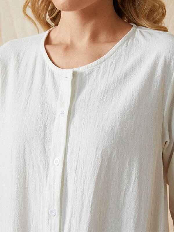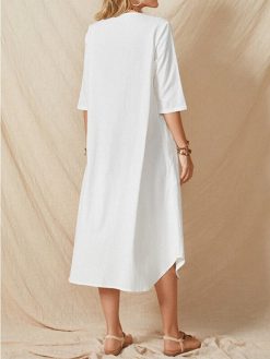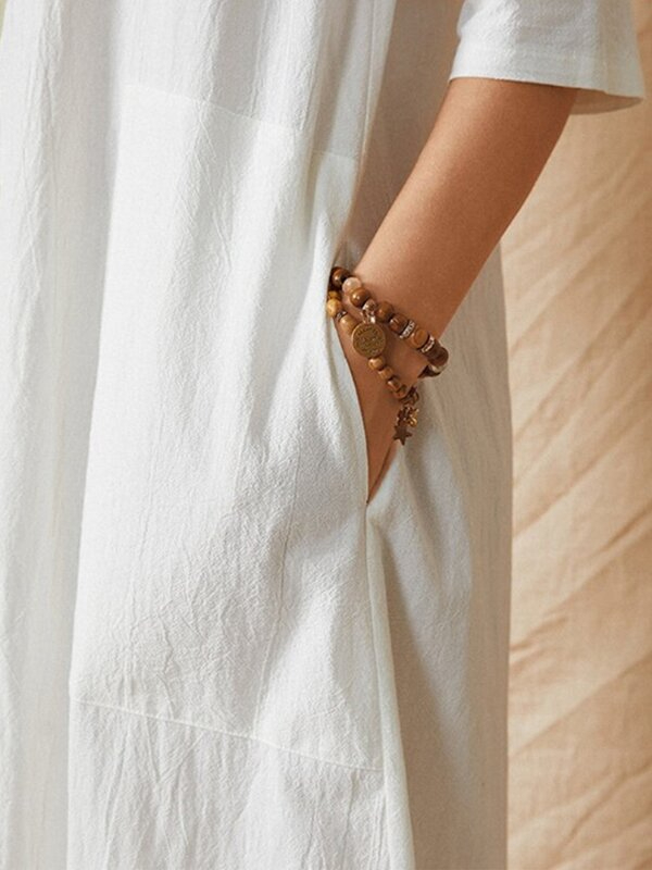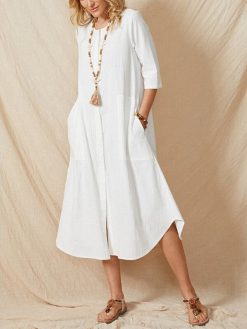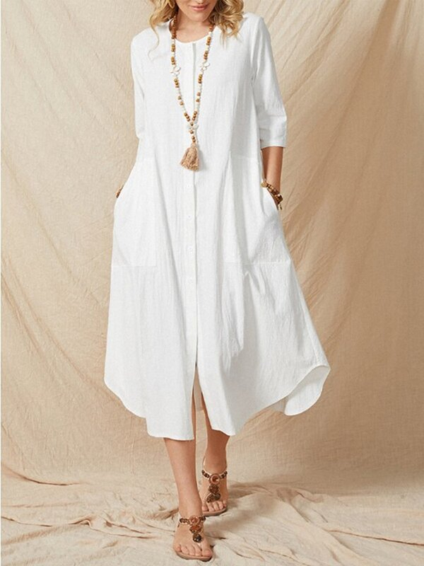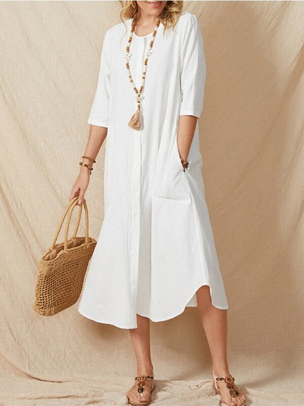Women’s Round Neck Single Breasted Solid Color Cotton and Linen Dress