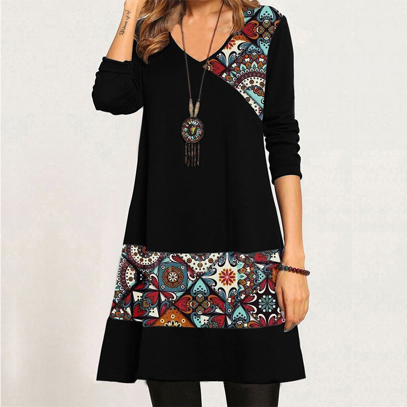 Women’s V-neck Printed Long Sleeve Dress